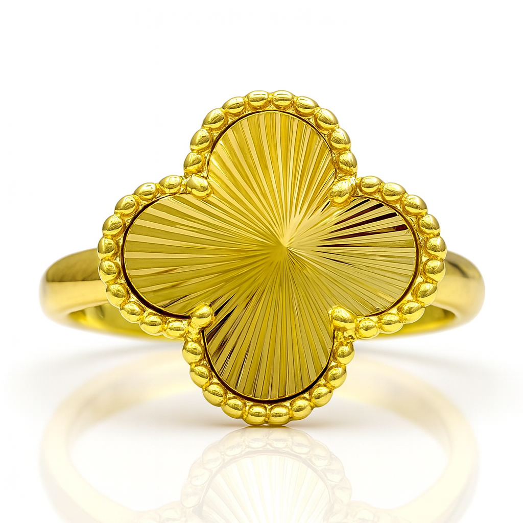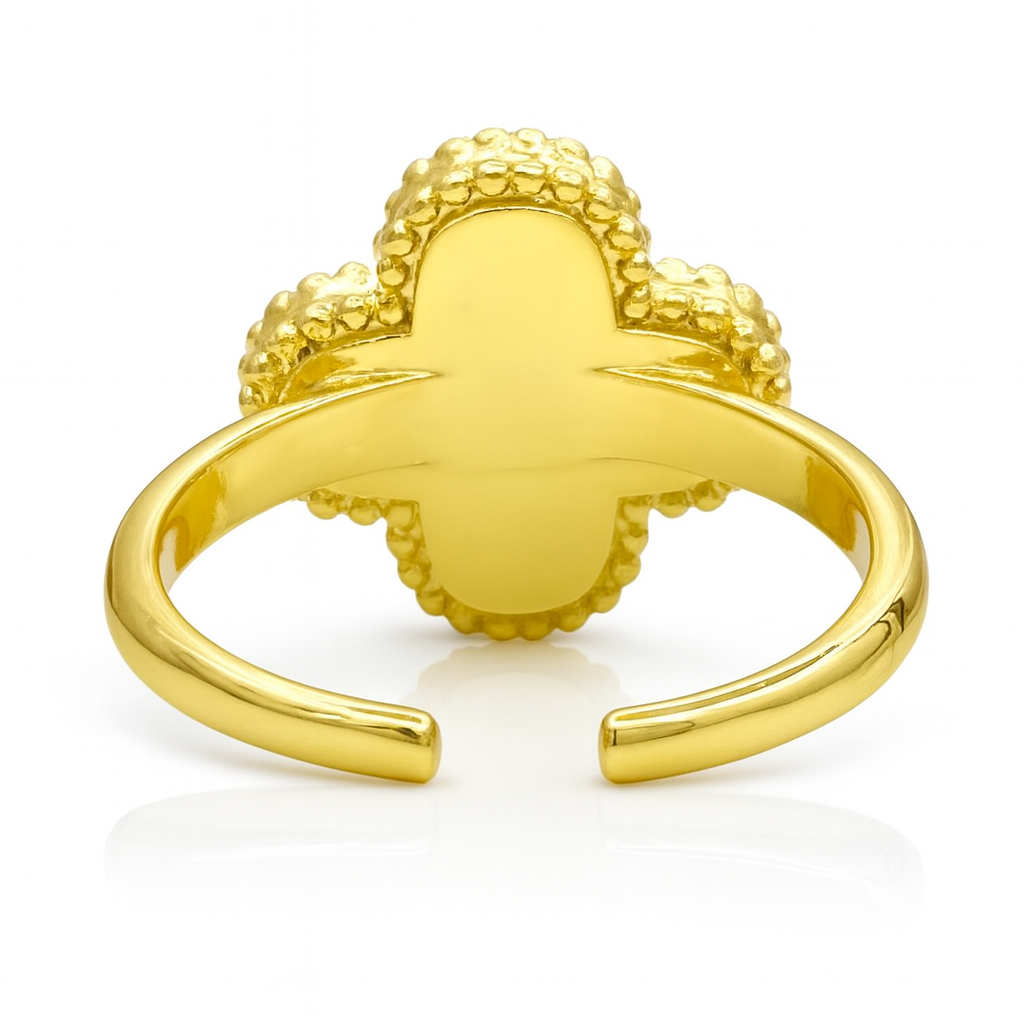 Elegante y moderno, este anillo con diseño de trébol y acabado facetado aporta brillo y simbolismo a cualquier look. Su baño de oro 18K ofrece un toque sofisticado, mientras que la talla ajustable (13 a 20) lo hace adaptable a distintos tamaños de dedo.