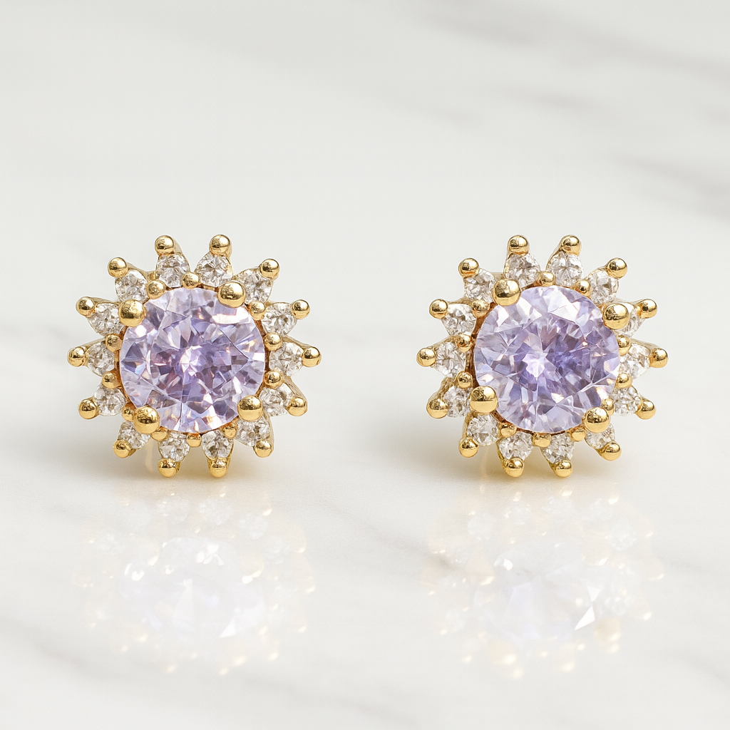 Un diseño elegante y femenino: el centro en tono amatista le da vida, rodeado de brillantes pétalos en circones que atrapan la luz con cada movimiento.